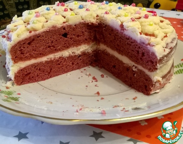 Известный торт, но без красного красителя. На сайте не нашла такого варианта приготовления и решила разместить свой. Мне очень хотелось испечь этот торт, но я не хотела использовать краситель и вот так получился этот рецепт. Очень приятный, влажный, в меру сладкий, думаю вам понравиться. Да и рецепт очень бюджетный!