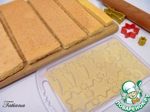 Далее нарежьте бисквит на пять полос:10-8-6-4-2 см.