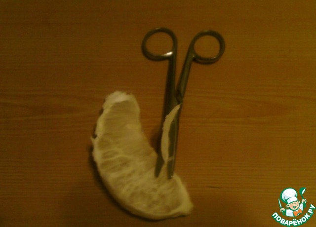 Очистить помело, отделив от фрукта необходимое количество долек (оставшуюся часть заворачиваем в пищевую плёнку и храним в холодильнике). Очень удобно снимать кожицу с долек, отрезав ножницами острую грань дольки - кожица тогда легко отделяется от мякоти. Мякоть лучше аккуратно ломать пальцами, а не резать ножом. Сок при этом не вытекает из мякоти.