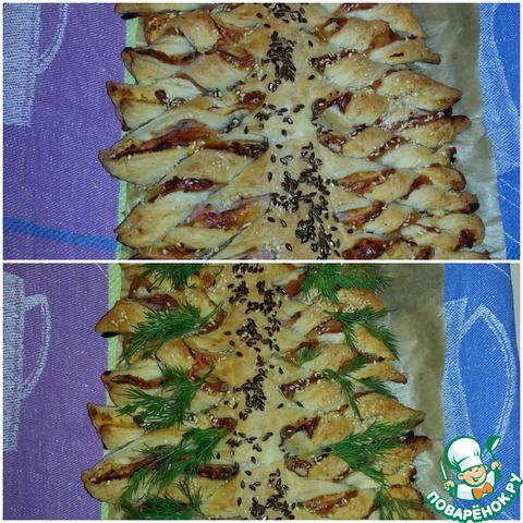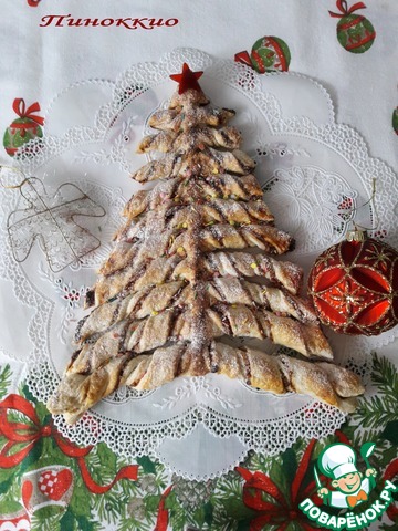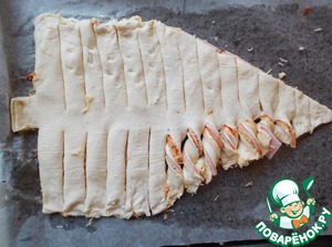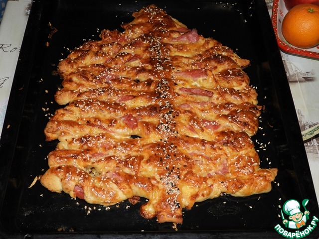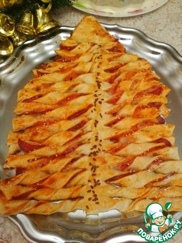 Оленька, великолепная елочка! Я сначала вырезала 2 елочки из теста, а потом уже на заготовках выкладывала продукты и формировала елочку. Хорошая несладкая начинка, я тесто сначала смазывала кетчупом. Очень красиво смотрится на столе. Спасибо за креативный рецепт!!!