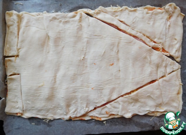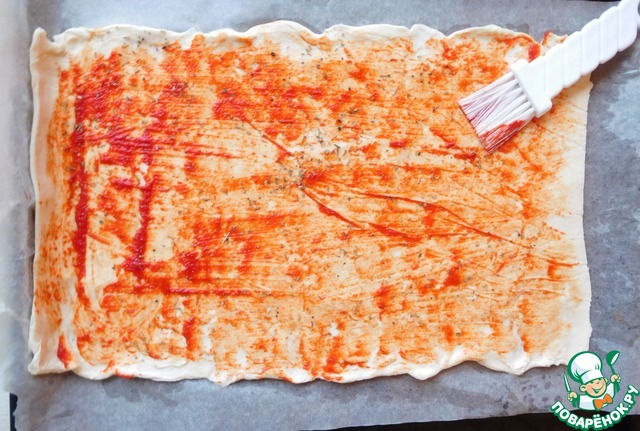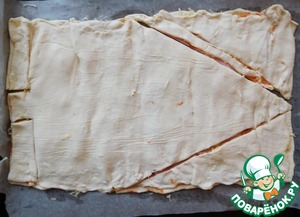 • Слоеное тесто раскатываем в длинный пласт и делим на две части.