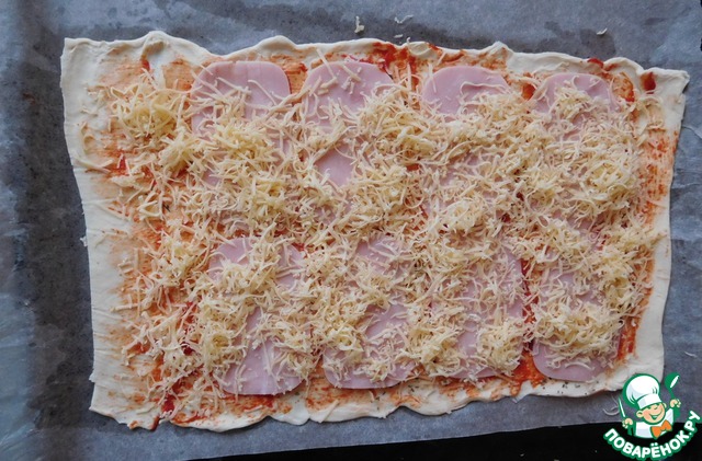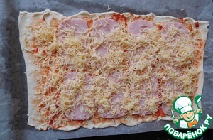 • Ветчину раскладываем по всей поверхности теста и посыпаем сыром, натертым на мелкой терке.