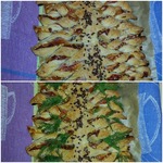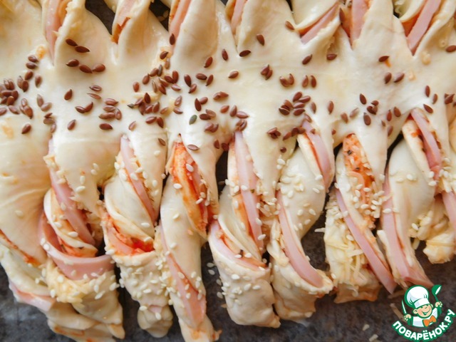 • Смазываем "елочку" взбитым яйцом. "Ветки" посыпаем кунжутом, "ствол" семенами льна.