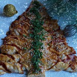 Вот моя ёлочка! Репетиция перед Новым годом! Правда начинку сделала сладкую, а такую как у Вас попробую в следующий раз. Пример сладкой начинки: курага, орехи (измельчить) , изюм - примерно в равных пропорциях. Одно маленькое яблоко натереть на крупной тёрке. Добавить жидкость из яблочного варенья, так что бы было можно начинку намазать. По желанию корицу и коньяк. Готовую посыпала пудрой и разноцветной посыпкой.