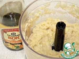 В чашу блендера сложить лук, чищенный чеснок, добавить соевый соус