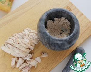 Филе остудить, мелко нарезать, небольшими порциями истолочь в ступке. -