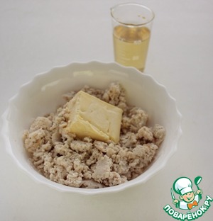 Затем положить в миску лёд и на льду ложкой выбивать куриную массу, прибавляя постепенно сыр, оставшееся мягкое сливочное масло, вино, соль, перец.