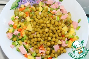 Перемешать, добавить зеленый горошек, получился любимый салат "Оливье". Если салат остался после новогодней ночи, пропускаем этот этап.
