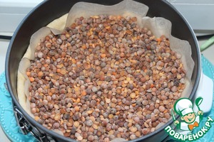 На тесто положить бумагу для выпечки, насыпать гороха и запекать 15 минут при температуре 180 градусов.