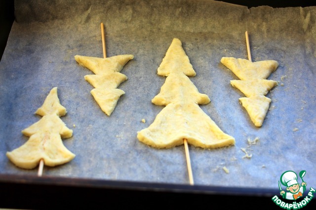 Из оставшегося теста вырезать елочки, вставить деревянные шпажки, можно посыпать солью и любимыми травами.