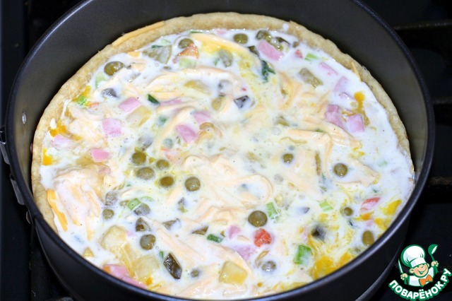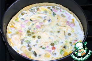 Делаем заливку: смешать все ингредиенты заливки вилкой и вылить поверх начинки.
