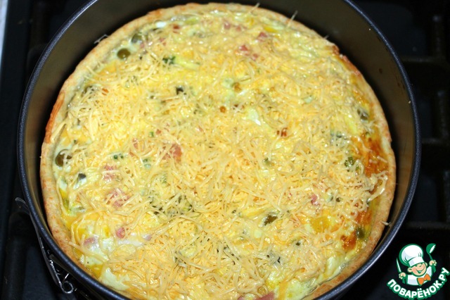 Убрать из теста бумагу с горохом, положить "Оливье", посыпать сыром Купеческий МК Белебеевский (оставить немного сыра для посыпки).