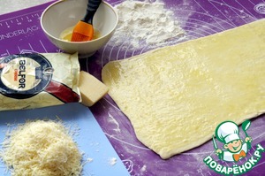 Упаковку слоёного дрожжевого теста (500 г) размораживаем, раскатываем до 0,5см и смазываем яйцом.