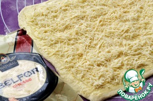 Сыр 150г (у меня "БЕЛЬФОР", изумительный сыр Белебеевского молочного комбината) натереть на мелкой тёрке и смачно так посыпать тесто.