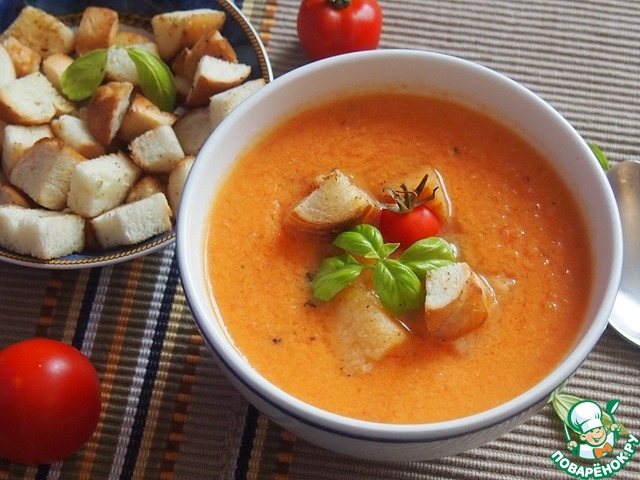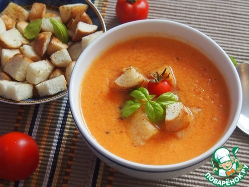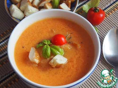 Подавать суп с поджаренными хлебными кубиками, украсив листиками свежего базилика и половинками черри.