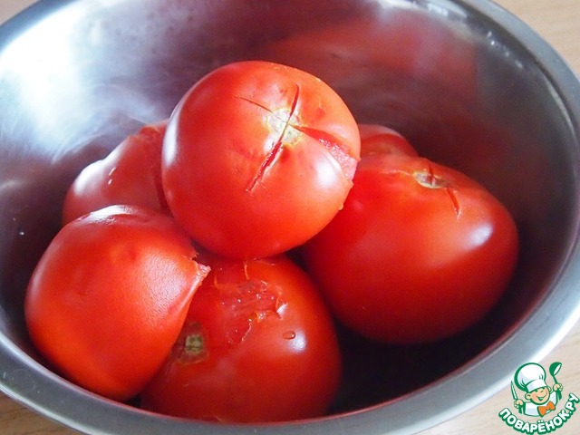 На помидорах сделать крестообразные надрезы на "попке", бросить в кипящую воду и варить две минуты. Затем опустить помидоры в холодную воду. Снять кожицу.