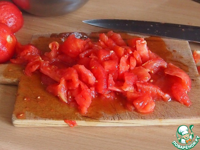 Из помидоров удалить серединку с семенами, плотную часть нарезать кусочками.
