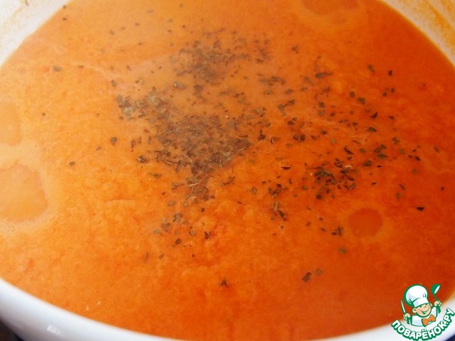 Добавить сушеные травы. Суп посолить по вкусу, добавить сахар, тоже ориентируясь на свой вкус и в зависимости от кислоты помидоров. -