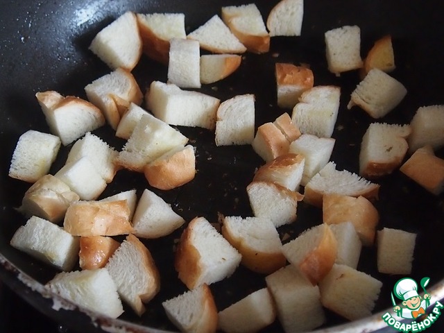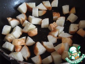 Вчерашнюю булку нарезать кубиками и поджарить на оливковом масле.