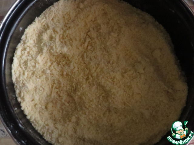 Всыпать соль, перемешать, добавить нарезанное кубиками масло и растереть в крошку.