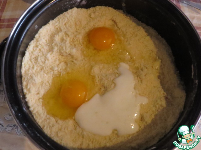 Сметану смешать с содой, влить в крошку, туда же добавить яйца.