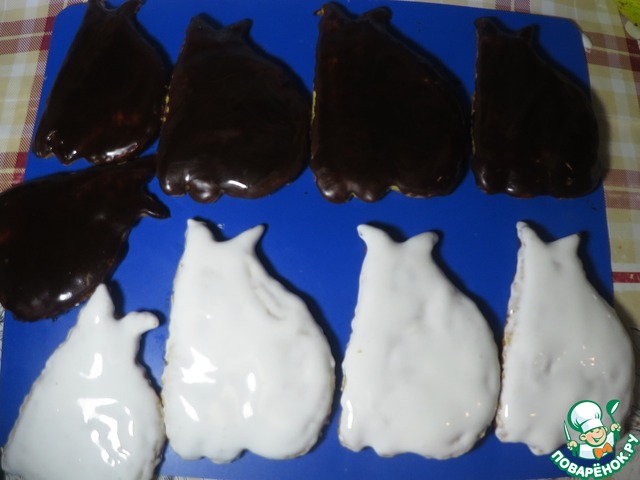 В оставшуюся белковую глазурь добавить еще около двух стол. ложек пудры и расписать шоколадных ''котиков''. Для этого можно воспользоваться полиэтиленовым пакетом, проколов в уголке дырочку зубочисткой, или кулинарным шприцем. Шоколад растопить на водяной бане и расписать белое печенье.