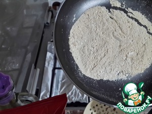 на горячей сухой сковороде обжариваем муку до золотистого цвета. Не пережарьте!!!
