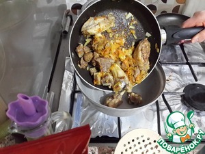 Выкладываем сюда же мясо, обжариваем 5 минут, не переставая помешивать. Перекладываем готовую зажарку в кастрюлю.