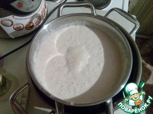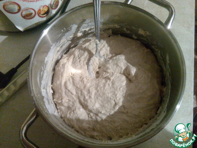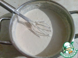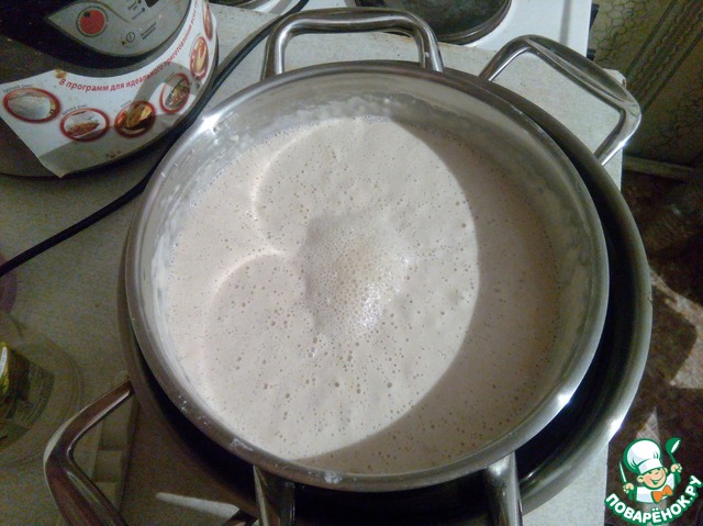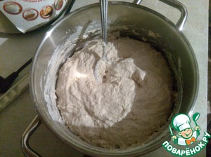 • Выливаем в кастрюлю, добавляем воду, размешиваем (мешать удобно венчиком). Добавляем муки столько, чтоб тесто получилось как на олальи. Теперь главное! Берем кастрюлю бОльшего диаметра, чем та, в которой тесто. Наливаем очень теплую, даже чуть горячеватую, но приятную для руки воду. И ставим в нее кастрюлю с тестом. Получается водяная баня. Закрываем тесто крышкой или полотенцем и ждем.