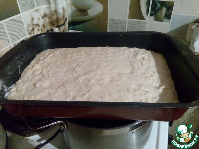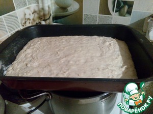 • Выкладываем в форму и ставим ее на кастрюлю с горячеватой водой, накрываем полотенцем, ждем когда поднимется и в духовку. Печь при температуре 200 С. На фото тесто немного уже поднялось.
