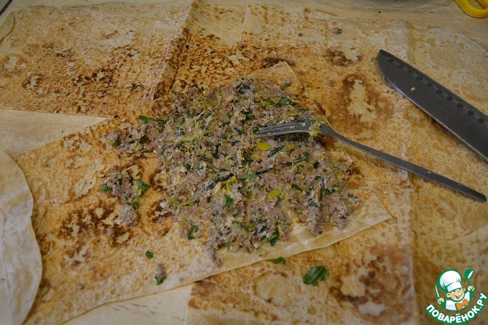 Разрезаем 1 лаваш на 4 части. На каждую часть кладем по 2-3 ст. л. фарша и буквально втираем его в лаваш, стараясь максимально уплотнить, чтобы рулеты хорошо скручивались. Фаршем нужно натереть 2/3 - как на фото.