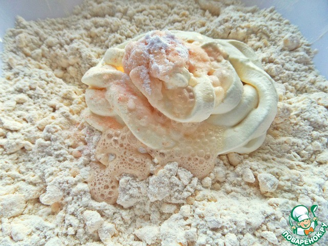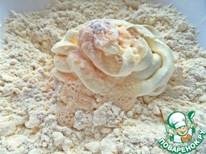 Я делала в 2 этапа, вот первый пласт. У меня мука с вкраплениями отрубей (эстонская), отсюда такой вид теста, но зато полезнее обычной белой муки.