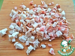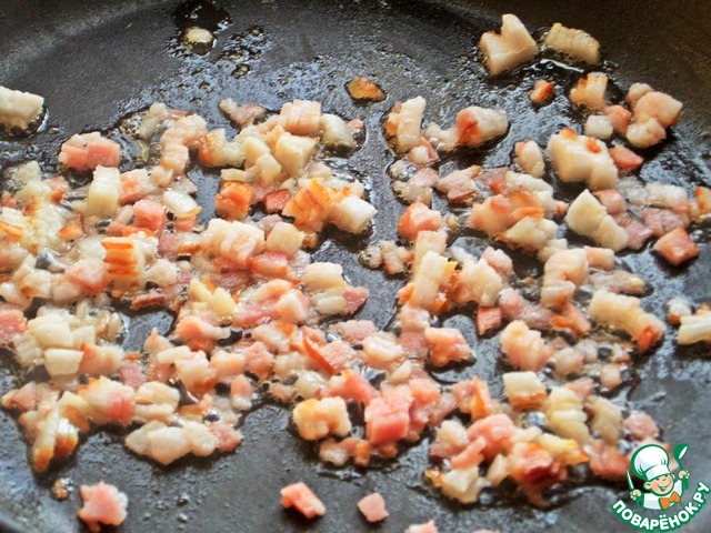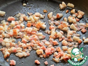 Бекон покрошить прямо замороженный на мелкие кубики.