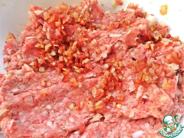 Пересыпаем бекон к фаршу, тщательно вымешиваем, лишний жир сливаем со сковороды, но оставляем немного.