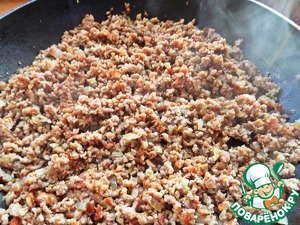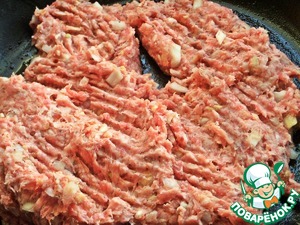 Перекладываем фарш в ещё горячую сковороду и быстро разбиваем вилкой на частички.