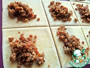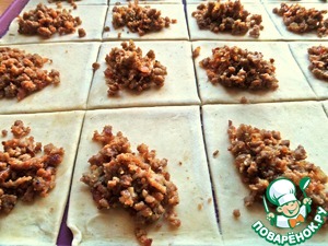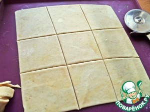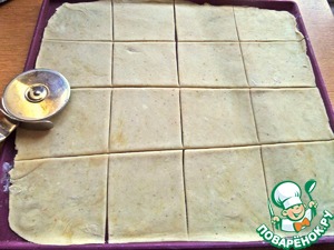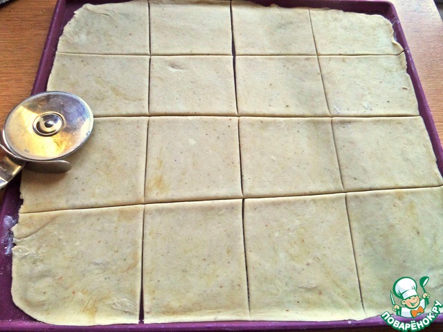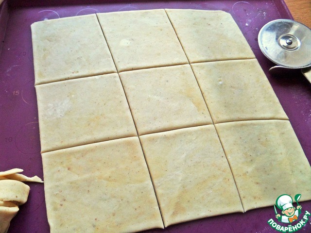Раскатать тонко, поделить на квадраты, обрезки убрать к остальному тесту.