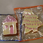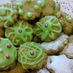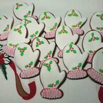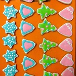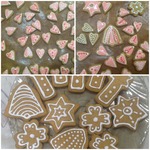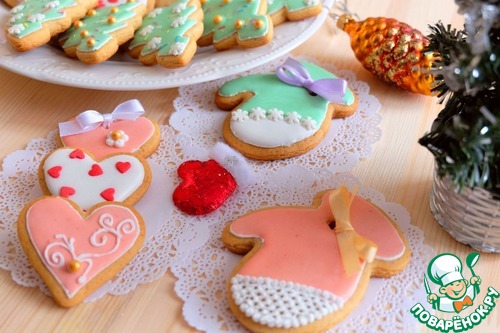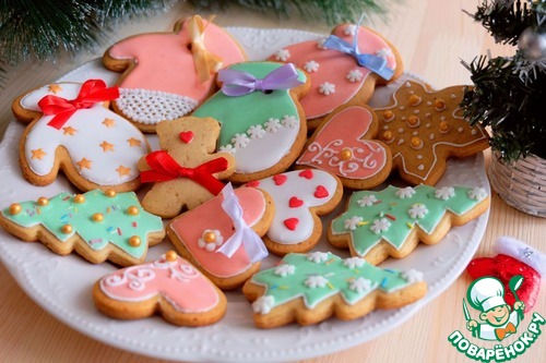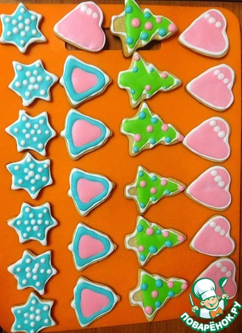 В кондитерском мешке сделать не большое отверстие, выложить глазурь в кондитерский мешок, отсадить по контуру печенья тонкую линию. Далее глазурь выложить в емкости, добавить пищевой краситель, при необходимости добавить небольшое количество кипяченой воды для лучшей заливки поверхности печенья. Оформить печенье по вкусу. Для оформления печения использовались: кондитерская цветная посыпка, посыпка в виде золотых жемчужин и посыпка в виде снежинок.