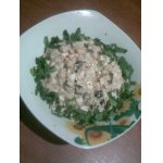 Очень вкусный салат из обычных продуктов. Но ведь и обычные продукты можно приготовить и подать так, что равнодушных не останется. Секрет салата в печеном чесноке. Свежий чеснок и печеный - это две большие разницы; печеный чеснок приобретает нежный сладковатый вкус, он прекрасно выглядит и очень облагораживает любое блюдо. Салат просто необходимо попробовать!