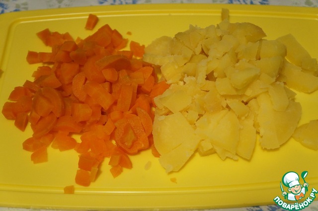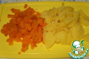 Морковь и картофель нарезать кубиками. Яйца покрошить.