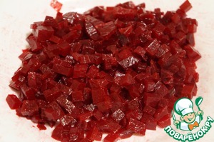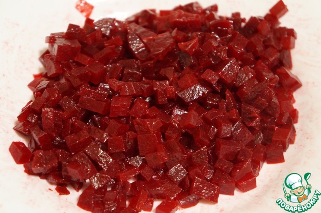 Свёклу нарезать кубиками, добавить чайную ложку масла. Это делается для того, чтобы свёкла не сразу окрасила остальные овощи в салате, а овощи "играли" своими красками. Отставить в сторону.