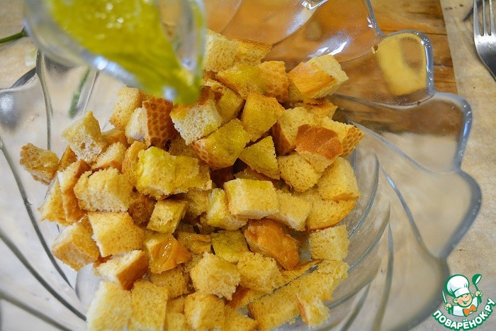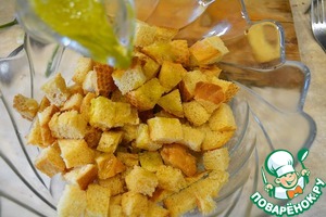 Поливаем заправкой еще горячие подрумянившиеся сухари и перемешиваем.