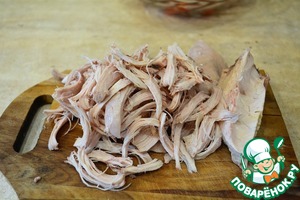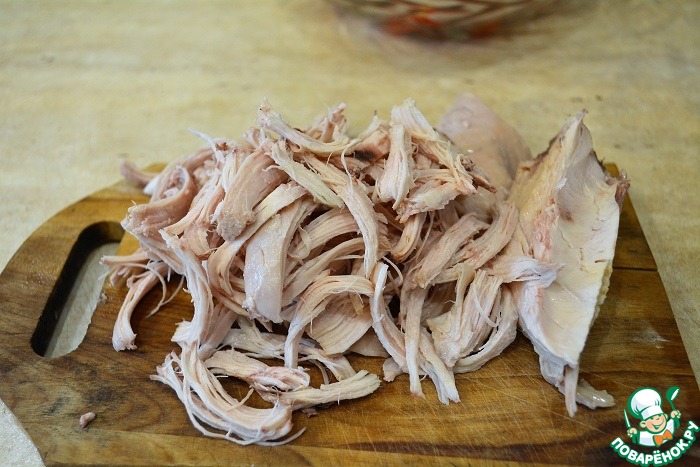 Отварную куриную грудку рвем руками на волокна