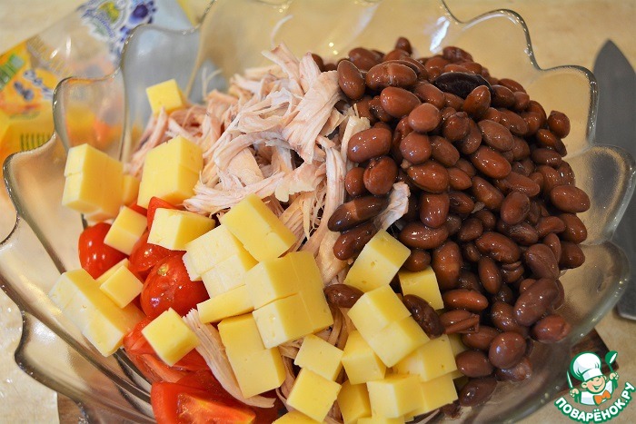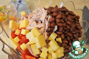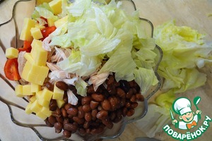 Отправляем все в глубокий салатник. Добавляем консервированную фасоль.