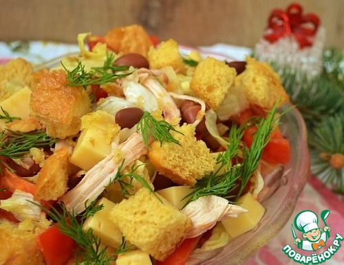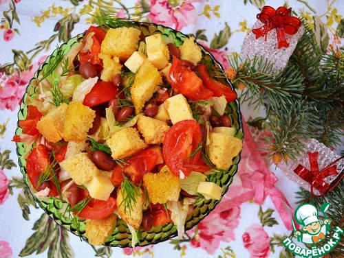 Перекладываем в сервировочную тарелку и посыпаем сухариками. Для заправки отдельно подаем сметану - чтобы салат не "плавал" в жидкости. Каждый сам заправляет свою порцию салата. Так же лучше поступить и с солью.