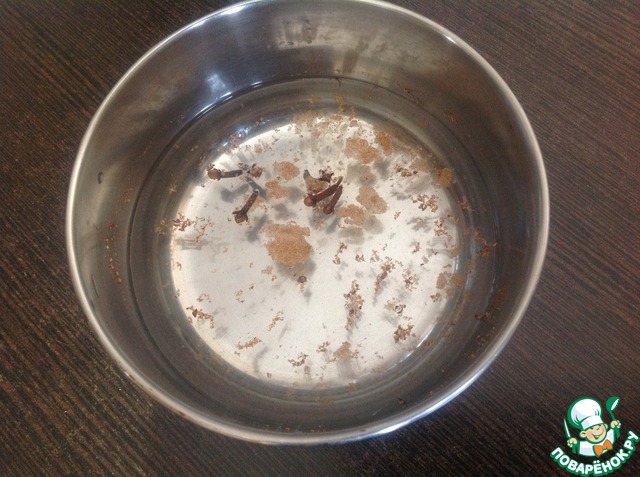 В сотейник налить 1 стакан воды, добавить гвоздику, корицу, мускатный орех. Довести до кипения и варить 1 минуту. Накрыть крышкой и дать настояться 10 минут.