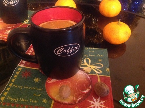 В вино добавить процеженный пряный отвар, кофе, половину ломтиков лимона и апельсина. Прогреть глинтвейн на слабом огне 15 минут, не доводя до кипения. Снять с огня и влить коньяк.