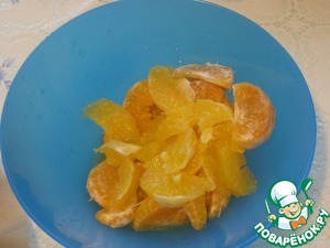 Помыть цитрусовые, почистить, разобрать на дольки, удалить косточки и белые пленки.