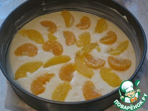 Выложить тесто в смазанную сливочным маслом форму, сверху разложить дольки цитрусовых.