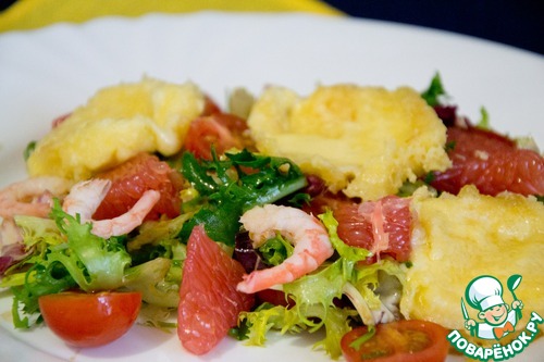 На тарелку выкладываем зелень с черри, бросаем креветки, кусочки грейпфрута и сверху кладем жареный сыр.
