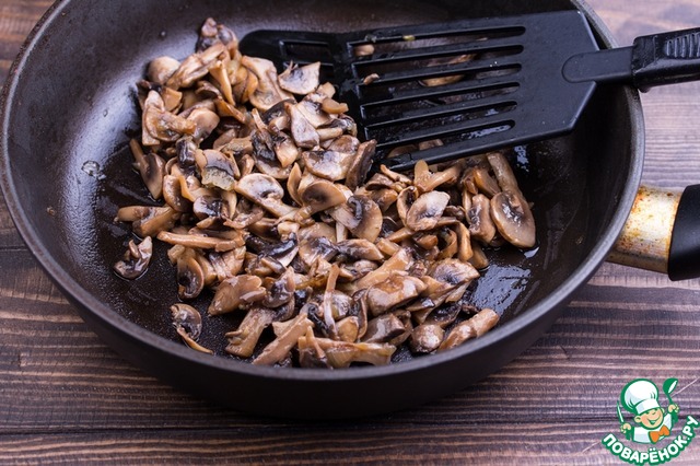 • Лук мелко порезать и слегка обжарить на части растительного масла. Добавить протертые влажной тряпочкой и порезанные шампиньоны, 1 ст. л. соевого соуса и еще немного обжарить. Отложить грибы на тарелку.